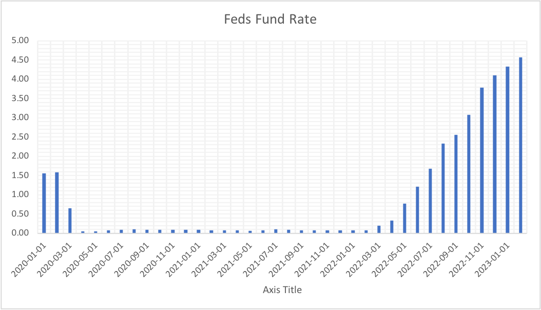 As shown in the table above, I want to examine the relationship between inflation and interest rate. As we know, the main objective of the FED is to keep inflation in check at around 2%, but they kept the interest rates near 0 % as the inflation started increasing at the beginning of April 2020 to 4.2 until reaching the 8.5 % level in March 2022. They decided to interest rate increase after April 2022 and kept increasing the rates continuously until March 2023, and since then, the rate increase has continued non-stop. As FED plays an independent role, one may ask what they were thinking between April 2021 (inflation rate 4.2 %) and May 2022 (inflation rate 8.5 %) by keeping the rates near 0%. Once a zero, now a hero.